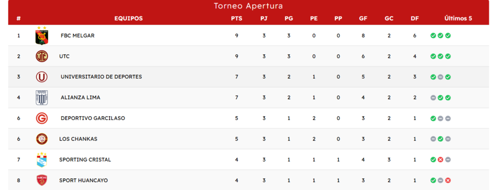 | 1 | Alianza Lima | 9 | 3 | 3 | 0 | 0 | 15 | 0 | 15 | |